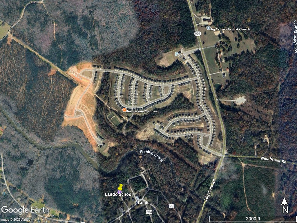 The hills that were once lined with mill houses are now lined with tract homes. With its easy access to I-77, Lando and surrounding towns have become bedroom communities for Rock Hill and Charlotte. This image from Google Earth shows a huge development on the other side of Fishing Creek, just north of the mill site.