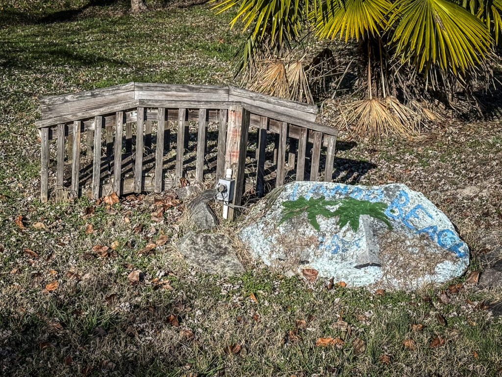 Next to the building was a small park with a tiny bridge, a lifeguard chair, and a rock with the painted phrase “Lando Beach.”