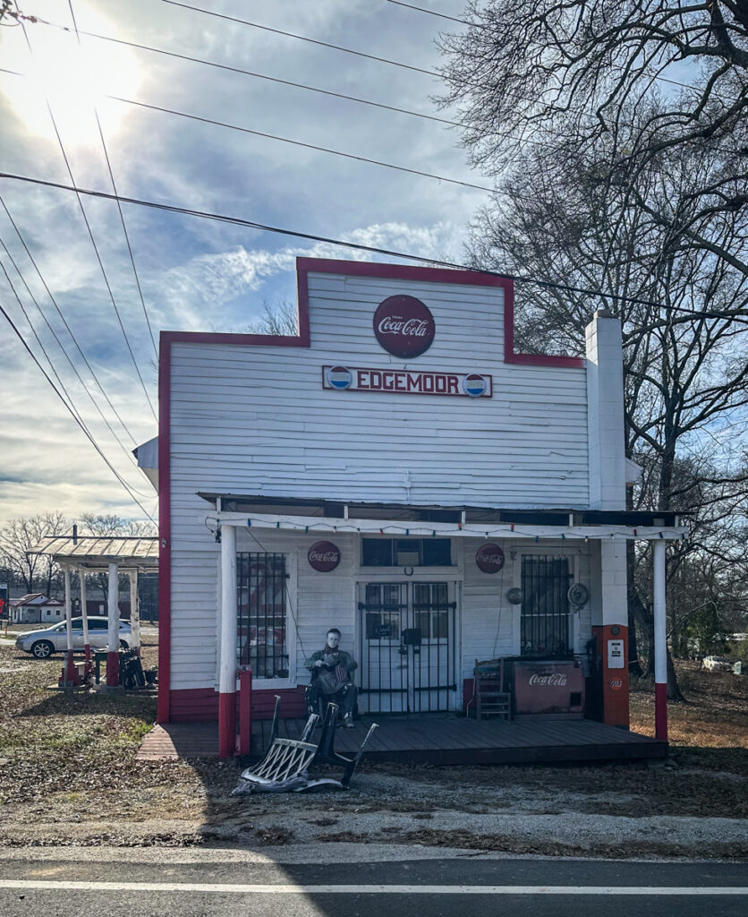 Since the town of Edgemoor had figured so prominently in Kaleb’s narrative, we figured we needed to pay it a visit. We headed up that way. Like Lando, it was pretty much a ghost town, but with new development taking place. There was one old country store that had been converted into an antique store.