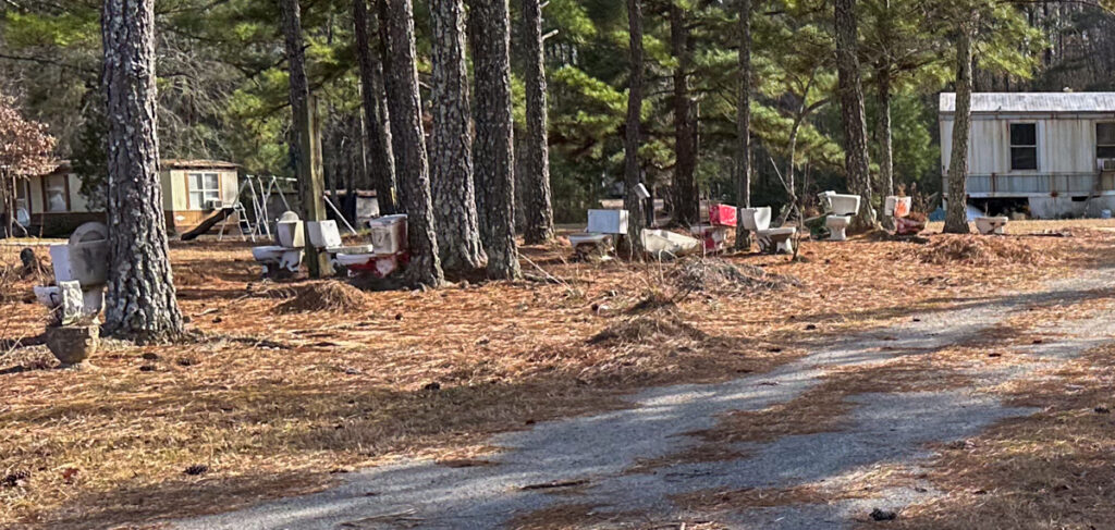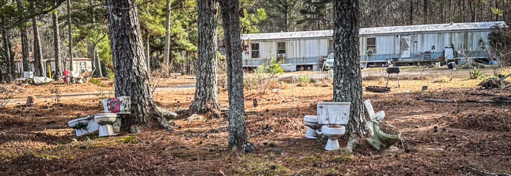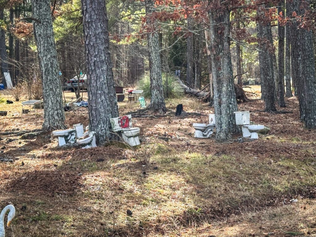 It was getting late in the afternoon. We decided to drive through the town of Lowry then head on home. The route took us through more rural area with some rather…interesting sights. There were a couple of mobile homes festooned with commodes. There were probable fifteen or sixteen, strategically placed around trees as some sort of decoration. I guess if you’re not inhibited you have a place to go.