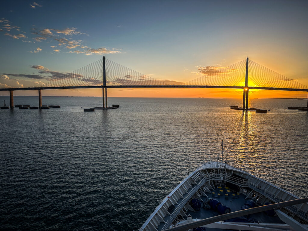The ship pulled out at 5:00. We watched the departure from the front of the upper deck, heading out from Hillsborough Bay and under the Sunshine Bridge at sunset.