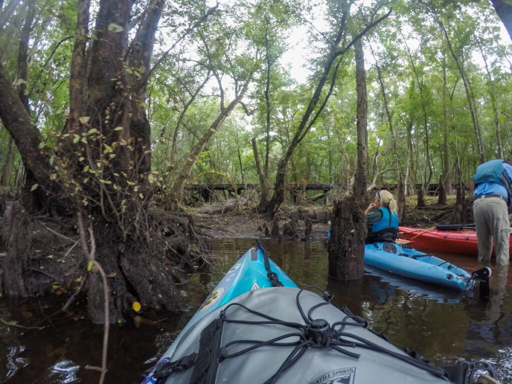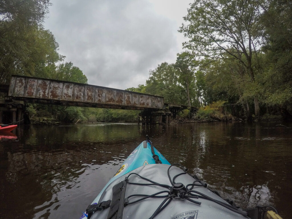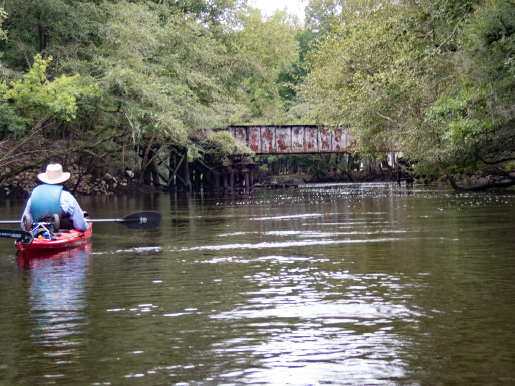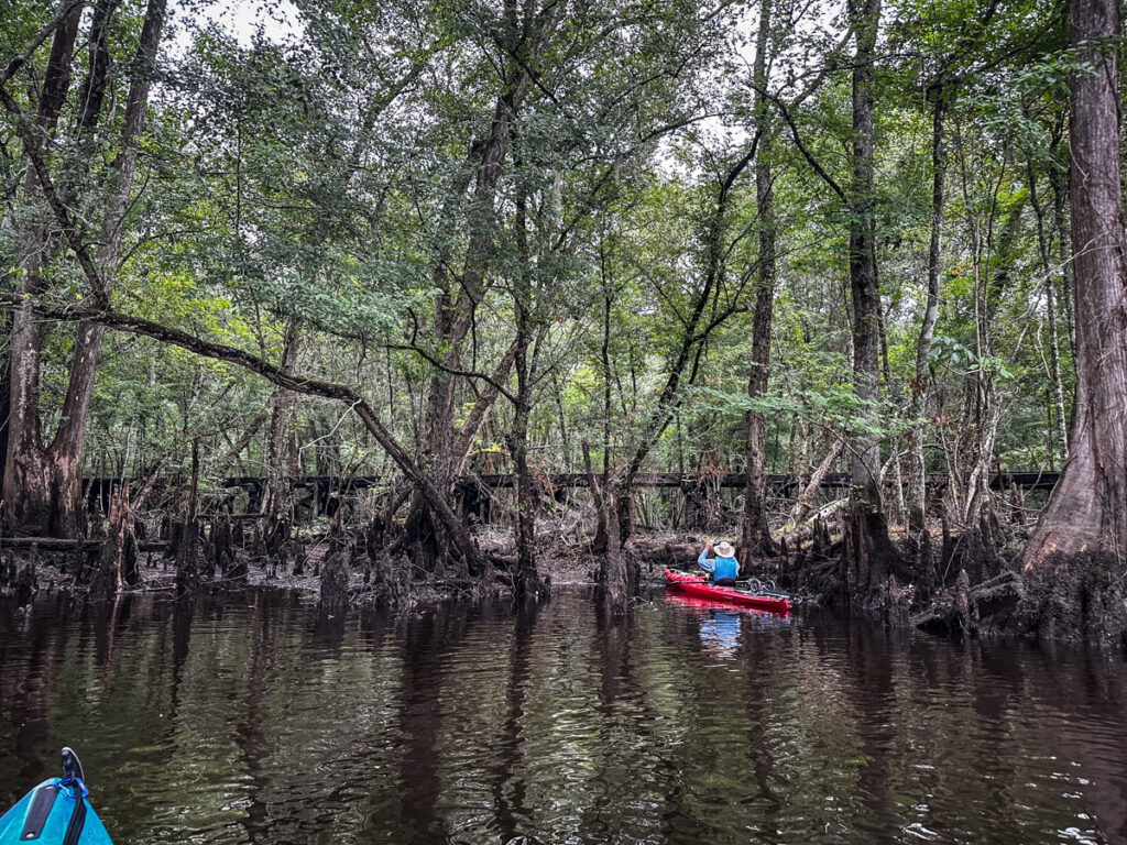Not far below the trestle we found a small cove and pulled into it. A longer trestle ran across the swampland. I’d never noticed this on previous paddles.