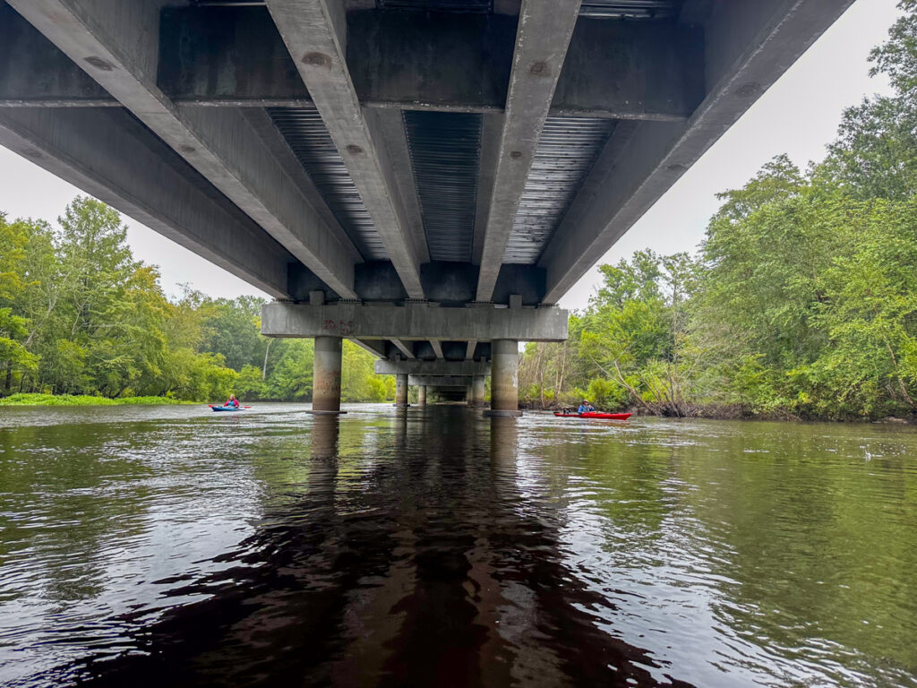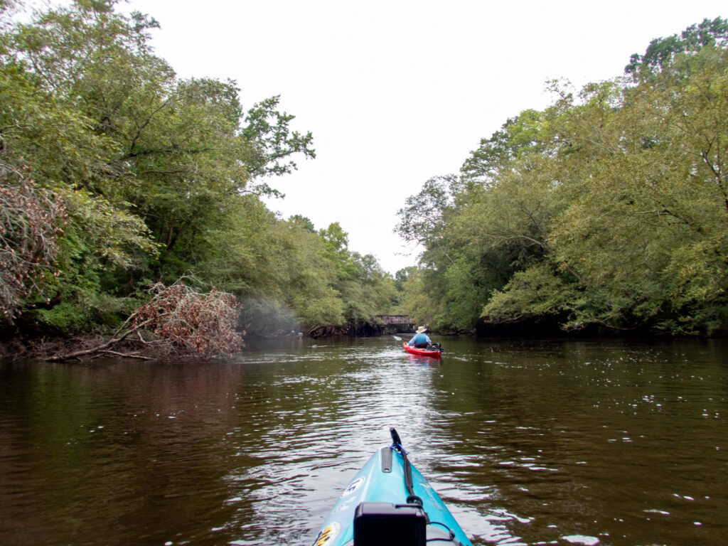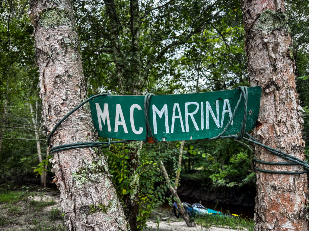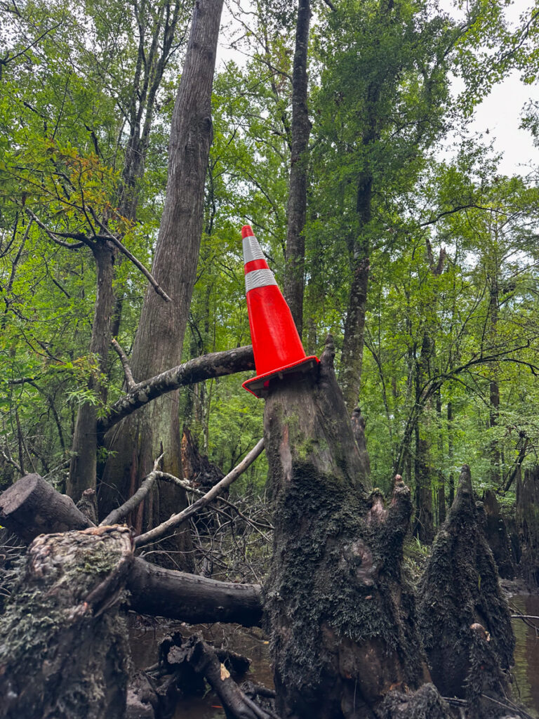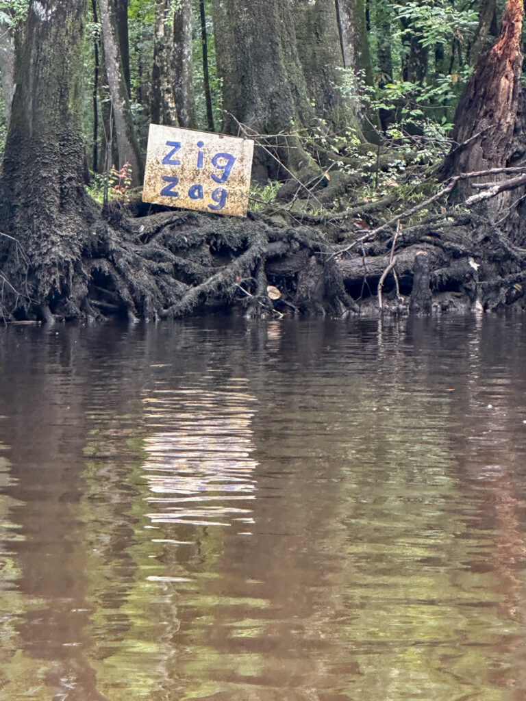 I had just paddled under this bridge earlier this summer with the South Fork group. About this time the rain let up. We continued on, and it wasn’t too long before we were at the entrance to the Zig Zag Landing. The landing is off of the main channel, so it’s easy to missed. Back June the water was so high that the sign was almost under water.