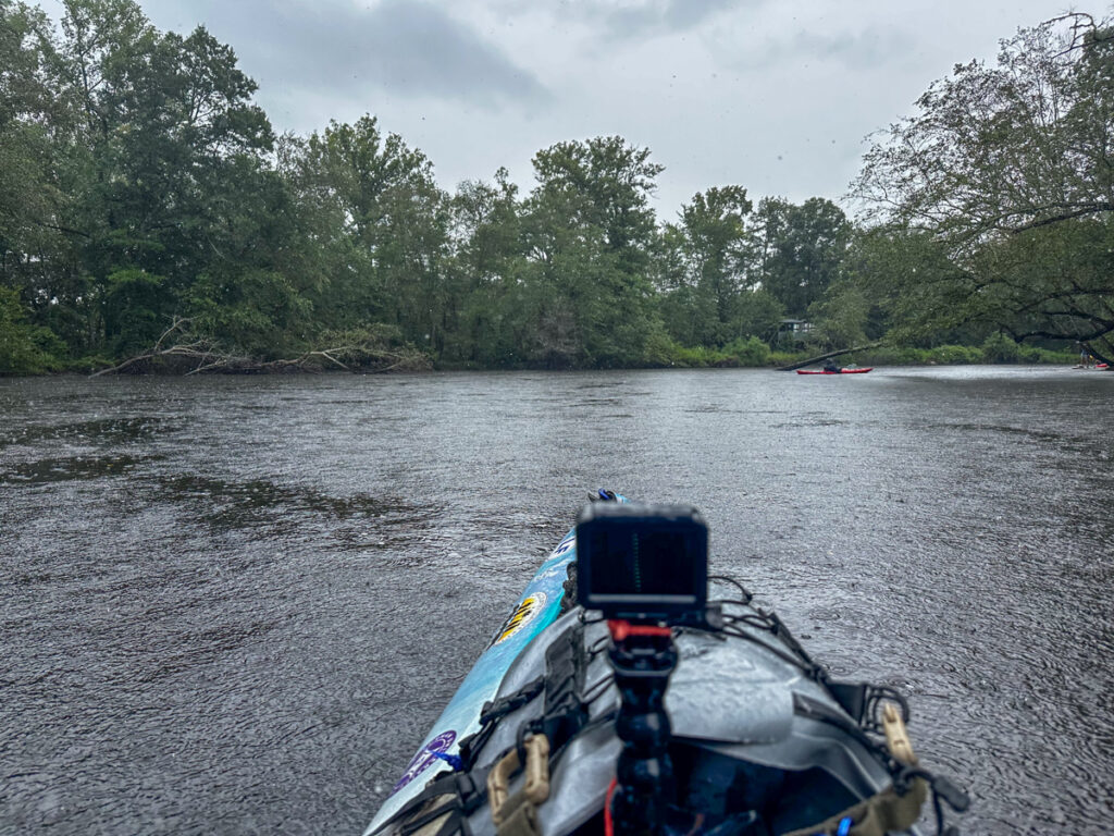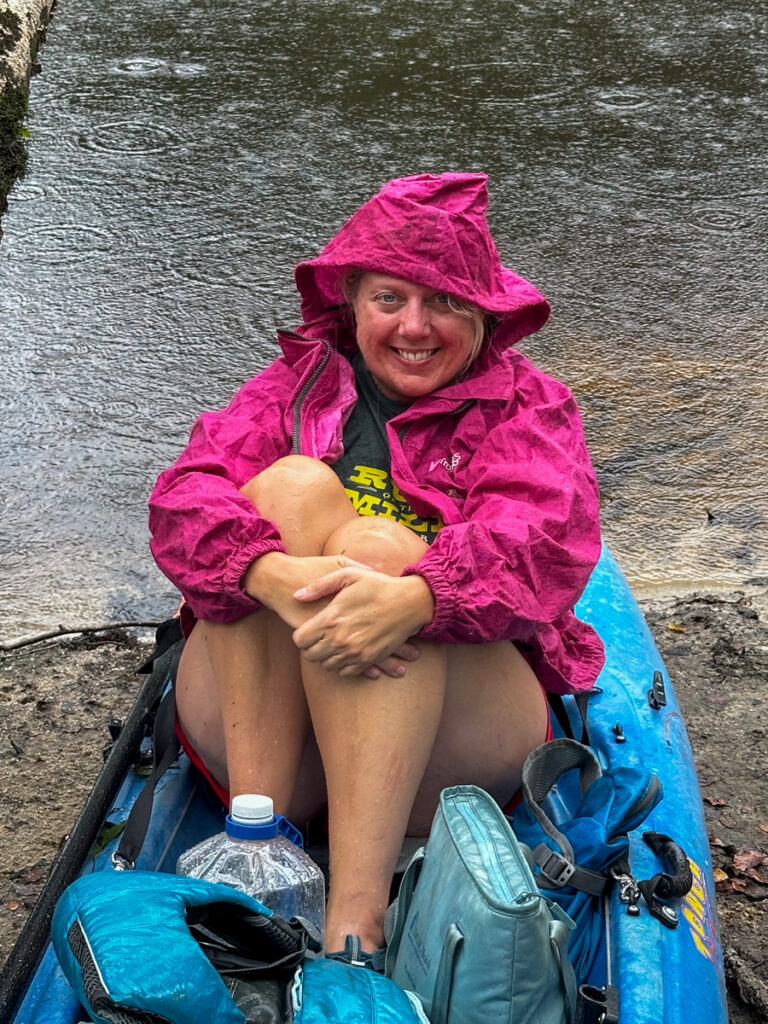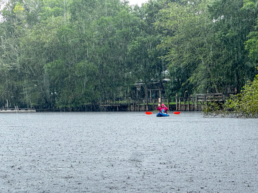 About the time we were getting packed up to leave it started raining in earnest. Since it had been so hot lately I didn’t bother packing my paddling jacket. Now I kind of wished I had it. Still, being chilly wasn’t too back compared to the sweltering heat of late. I actually don’t mind kayaking in the rain.