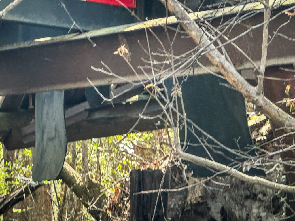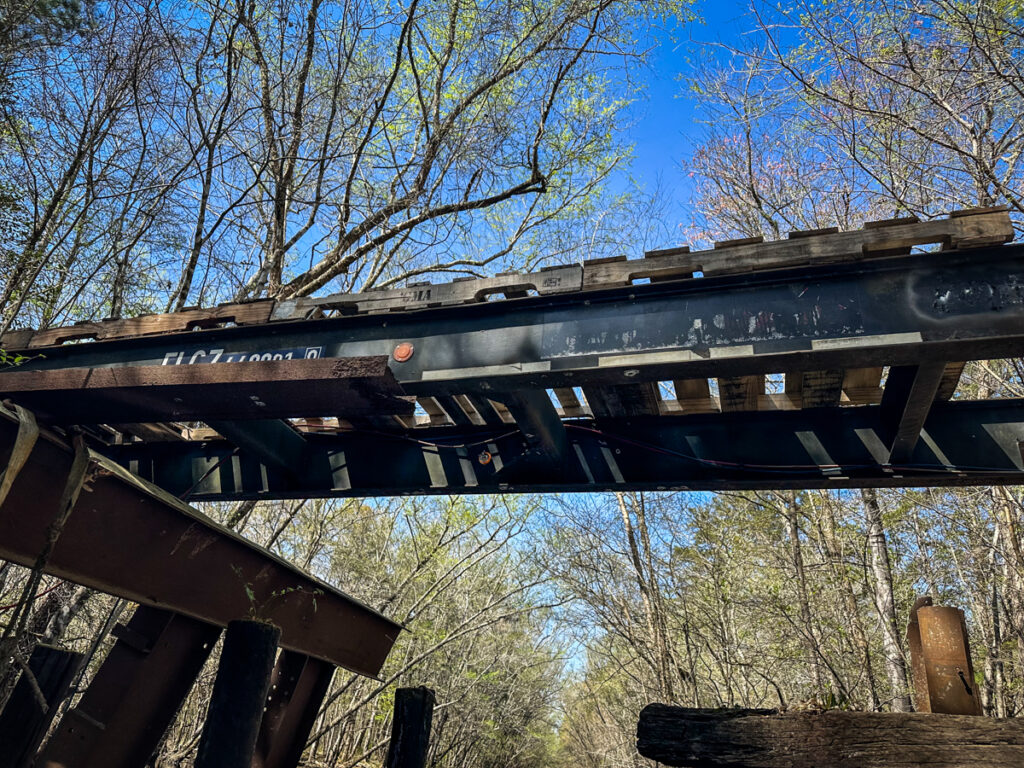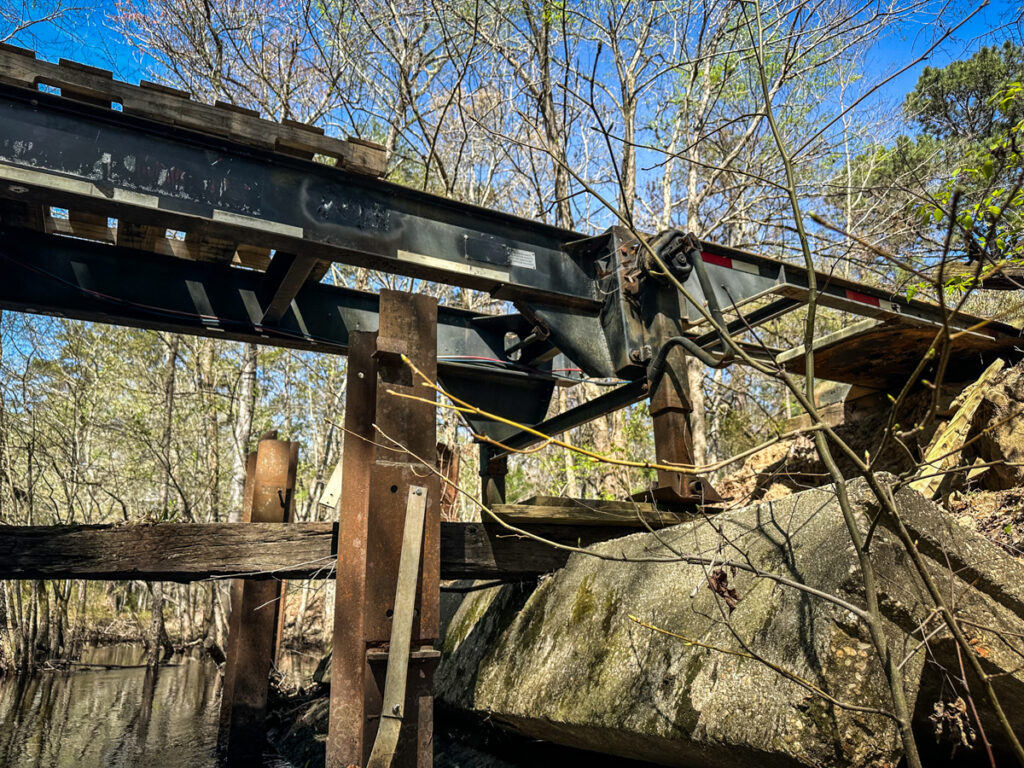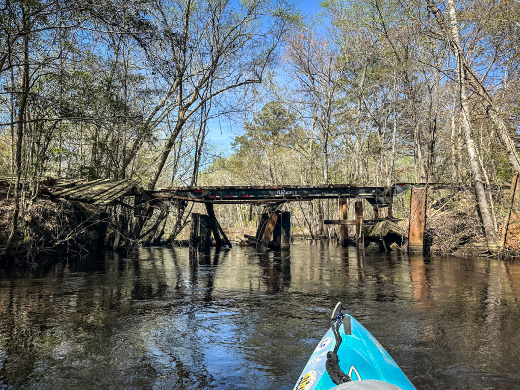 We passed Levenston’s Bluff and several decided to pull out and stop for lunch. I’d had a big breakfast, so I was OK with continuing. I got far enough ahead of the group that I was able to explore a canal that I’d marked on the previous trip. This went straight back from the main stem, eventually coming to a rather unusual bridge. It looked like a bridge with metal trusses had washed away. Its replacement was an old flatbed 18 wheeler, and the bed of the bridge was simple wooden pallets. The trailer still had its running lights and mud flaps.