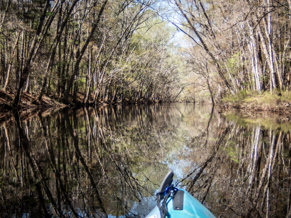 You get all flavors of the Edisto on this stretch, from wide open and straight to twisting and narrow. At one point we met two johnboats coming upriver. They said they had to turn back because there was a tree blocking the river. We did, indeed, find a tree, but our kayaks were able to get over it with no problem at all.