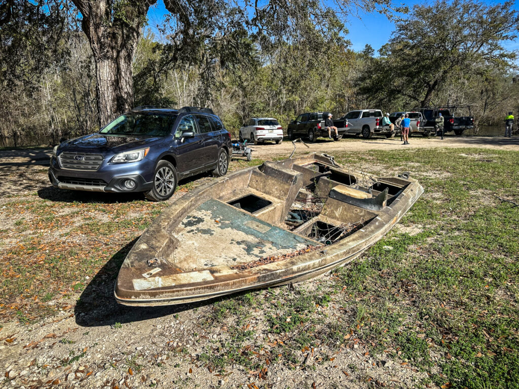 Several of us who had already unloaded our boats headed on down to Martin’s Landing early to await the shuttle. I found a nice parking spot under a tree, right next to an abandoned boat.