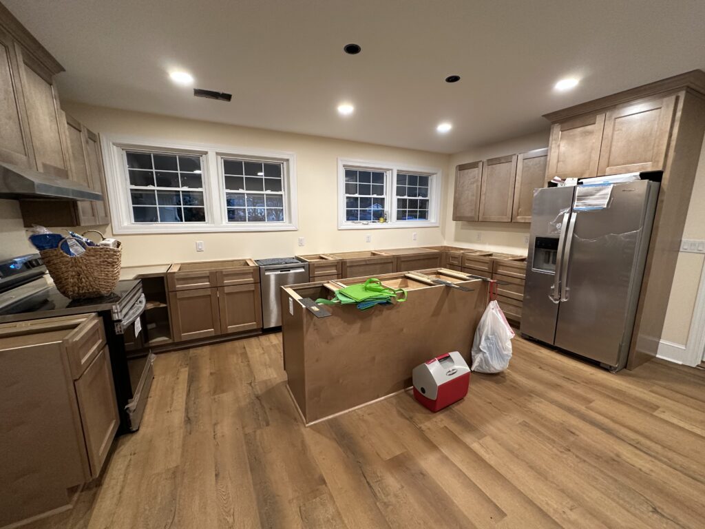 We are awaiting countertops for the cabinets. They were supposed to be delivered on Friday, but the granite company’s truck broke down. We can’t get the sink and plumbing attached until the counters are in place. We have a functioning refrigerator, so at least we can put food in there. We have a working stove, but we can’t really use it until the vent hood is hooked up to electricity.
