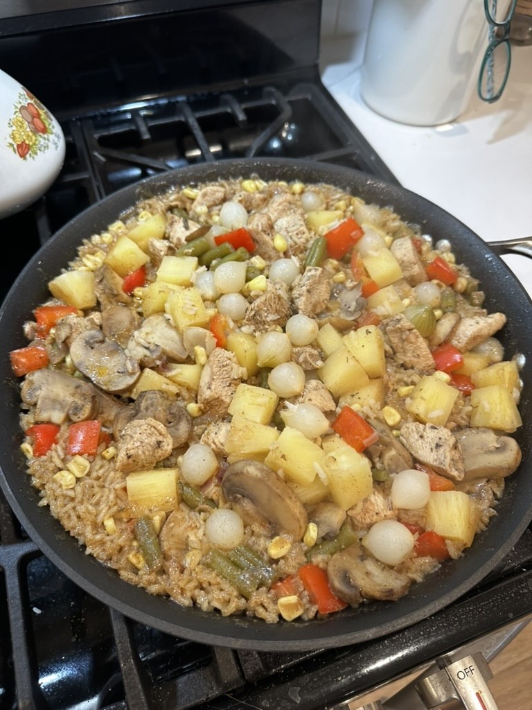 - Add frozen corn, frozen beans, pineapple, and pearl onions