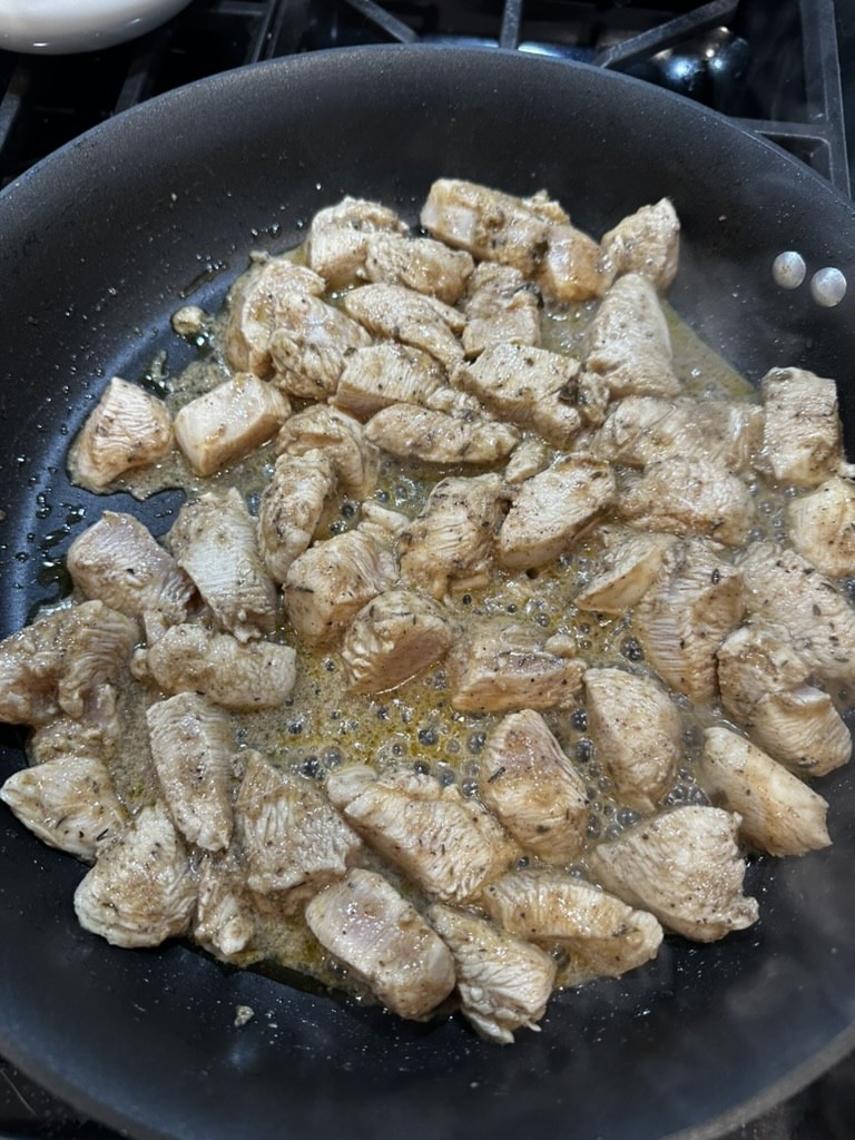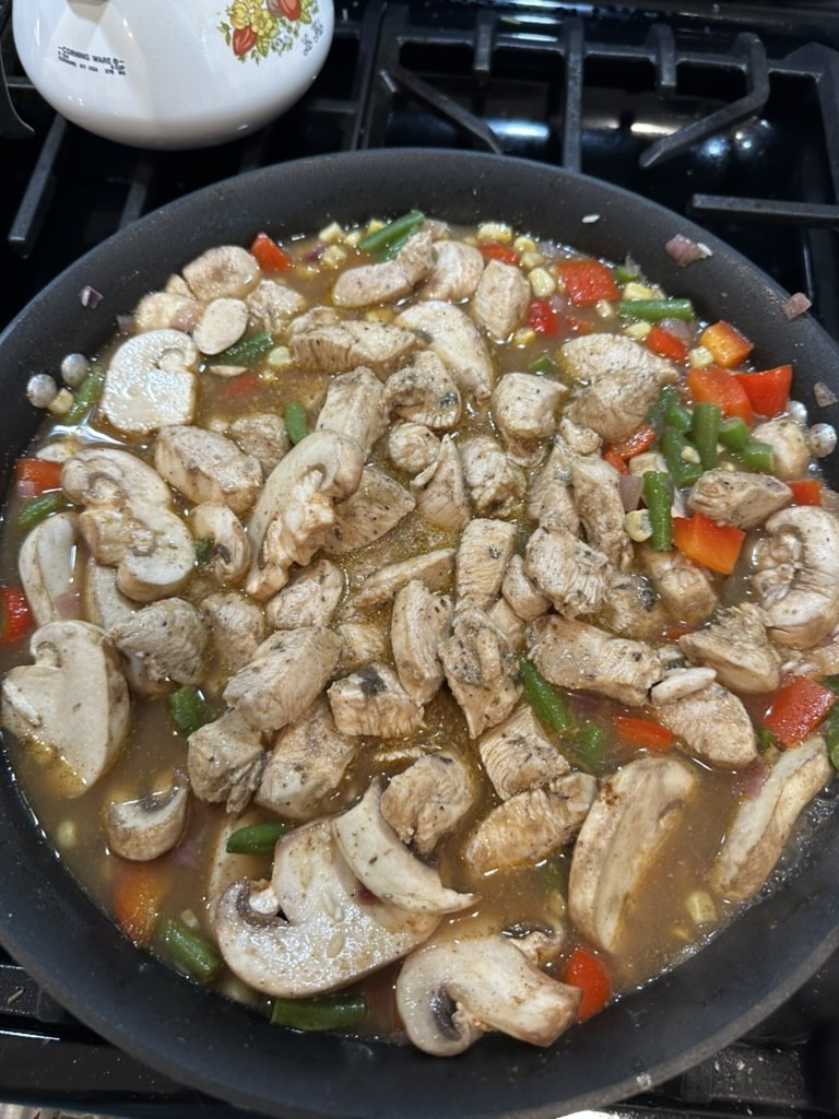 - Add marinated chicken and cook, occasionally stirring, until chicken is done.