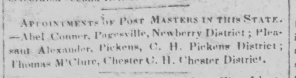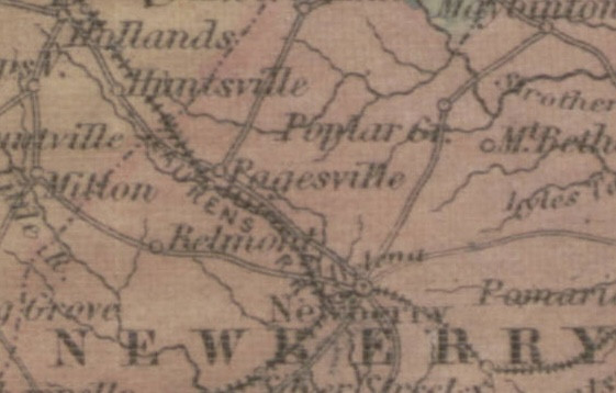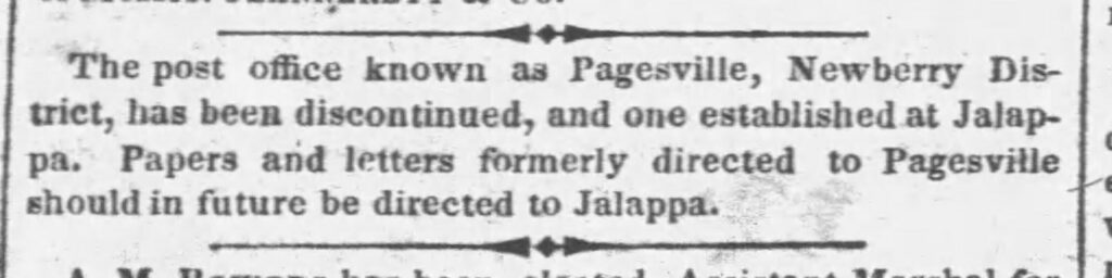 Prior to 1855 the community had been known as “Pagesville” or “Pageville.” I found an 1837 article in the Charleston Mercury about an appointment of a postmaster for Pagesville.