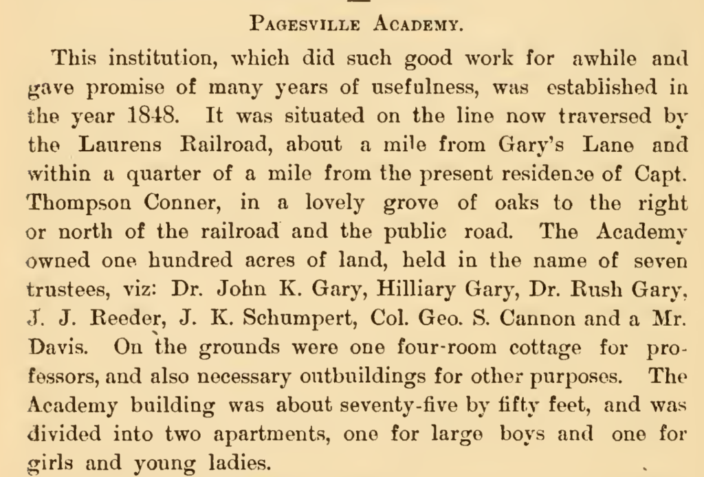 It’s not in the Robert Mill’s Atlas, but The Annals of Newberry, published in 1892, describes the Pagesville Academy.