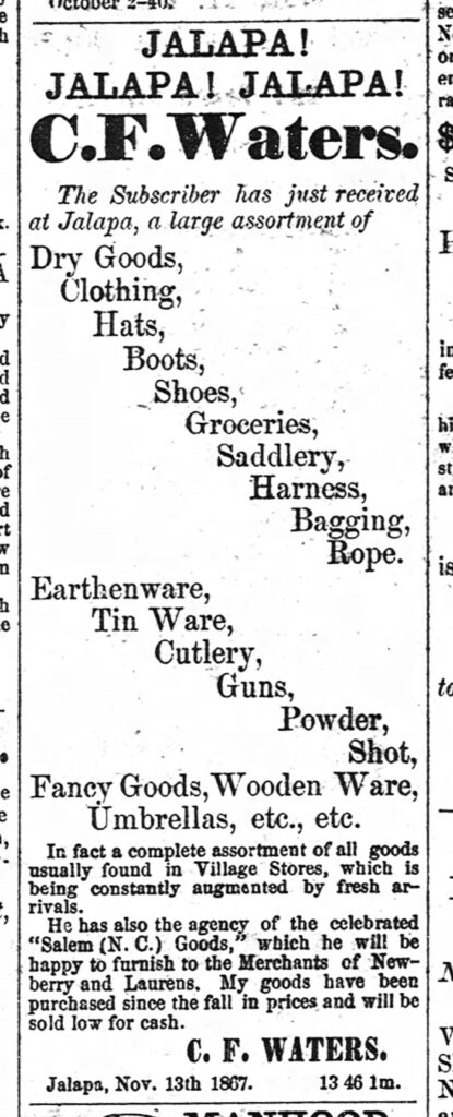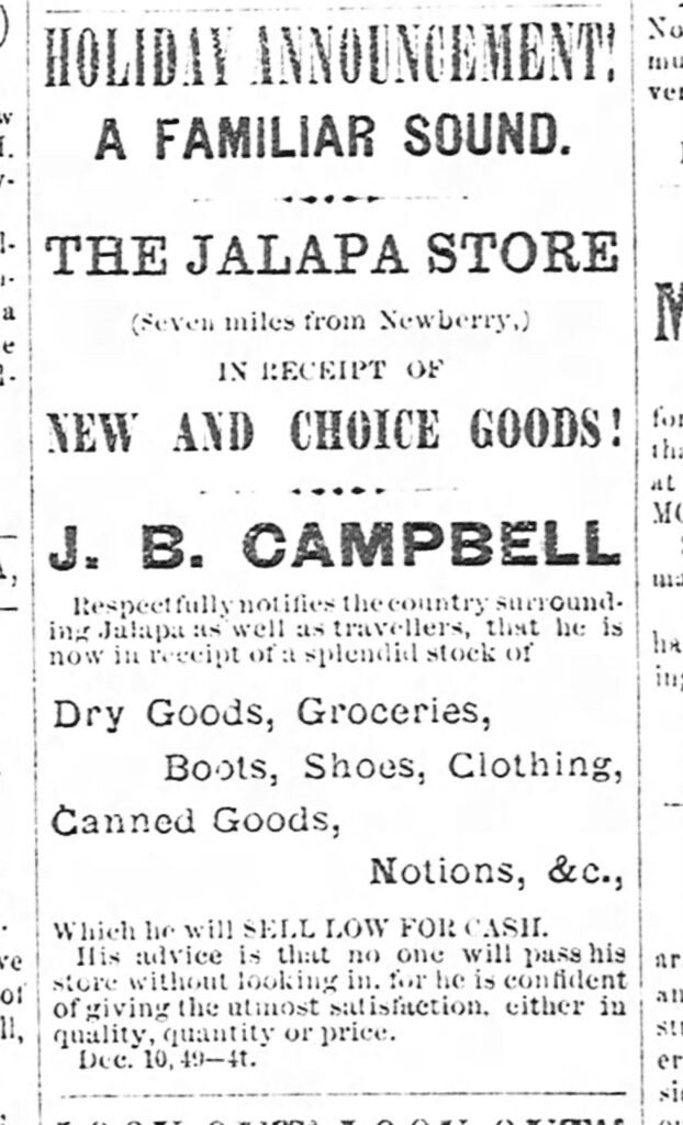 The name of the town comes from Xalapa, Mexico. In 1847 members of the Palmetto Regiment fought in the Battle of Cerro Gordo near the town in the state of Veracruz, including some soldiers from Newberry County. When they returned home, they renamed the community Jalapa. The city apparently made quite an impression. Even Ulysses Grant was impressed and wrote in his memoirs that Xalapa was “decidedly the most beautiful place I ever saw in my life” and its climate “the best in the world.”