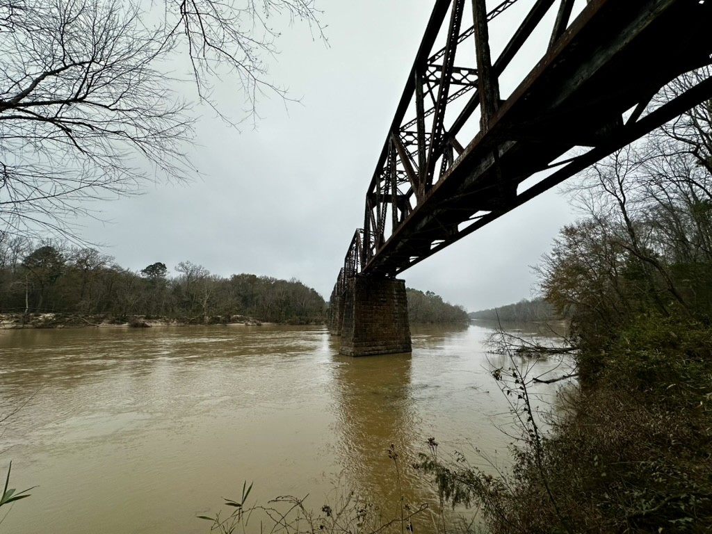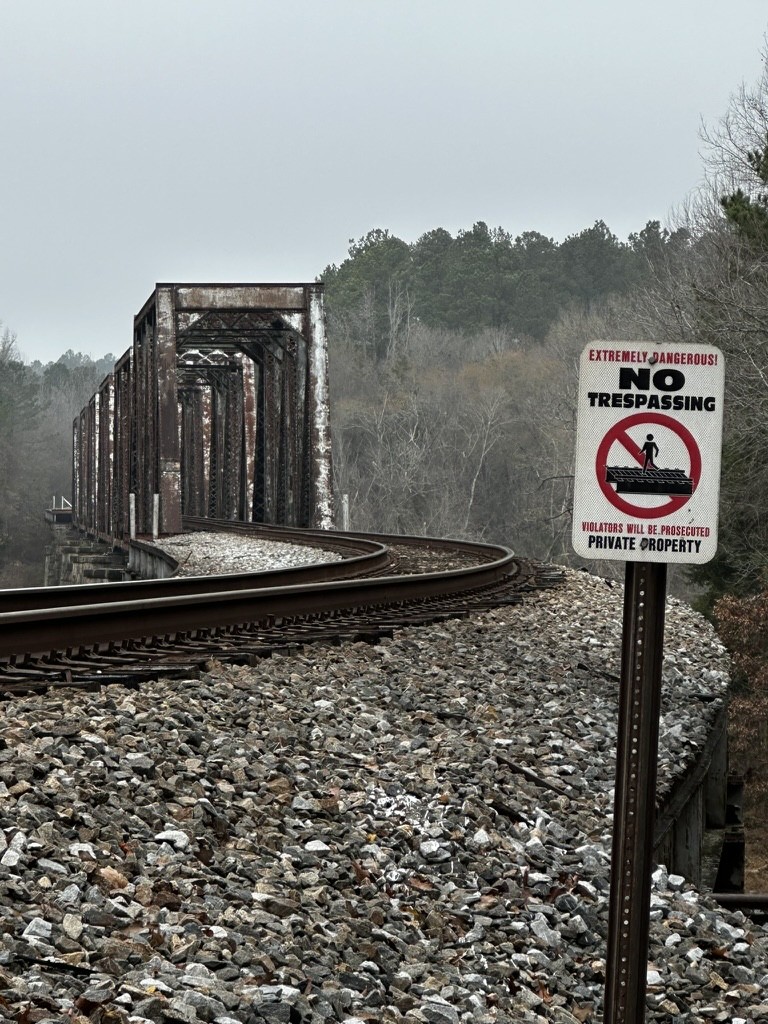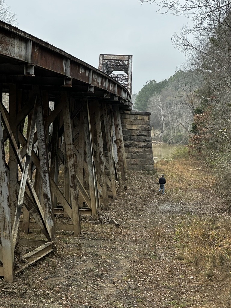 We parked the car and decided to walk down the river along the railroad tracks. There was a clear path so that we didn’t have to walk on the tracks themselves. When we reached the tracks there was a sign warning people not to walk on the trestle. We didn’t. We walked down an embankment and under the trestle toward the river.