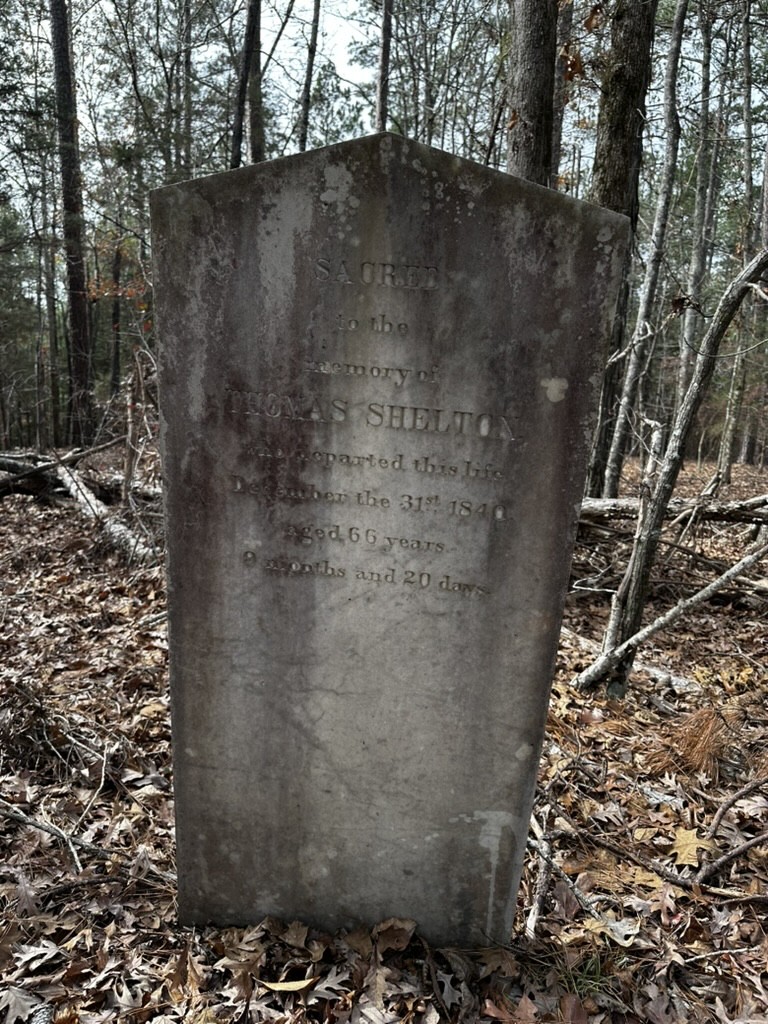 In the woods behind the cemetery we spotted even more headstones. We decided to check them out, and discovered history. These were the graves of the original Shelton family. We found the graves of David Shelton (with a new head stone), Thomas Shelton, and other members of the Shelton family.